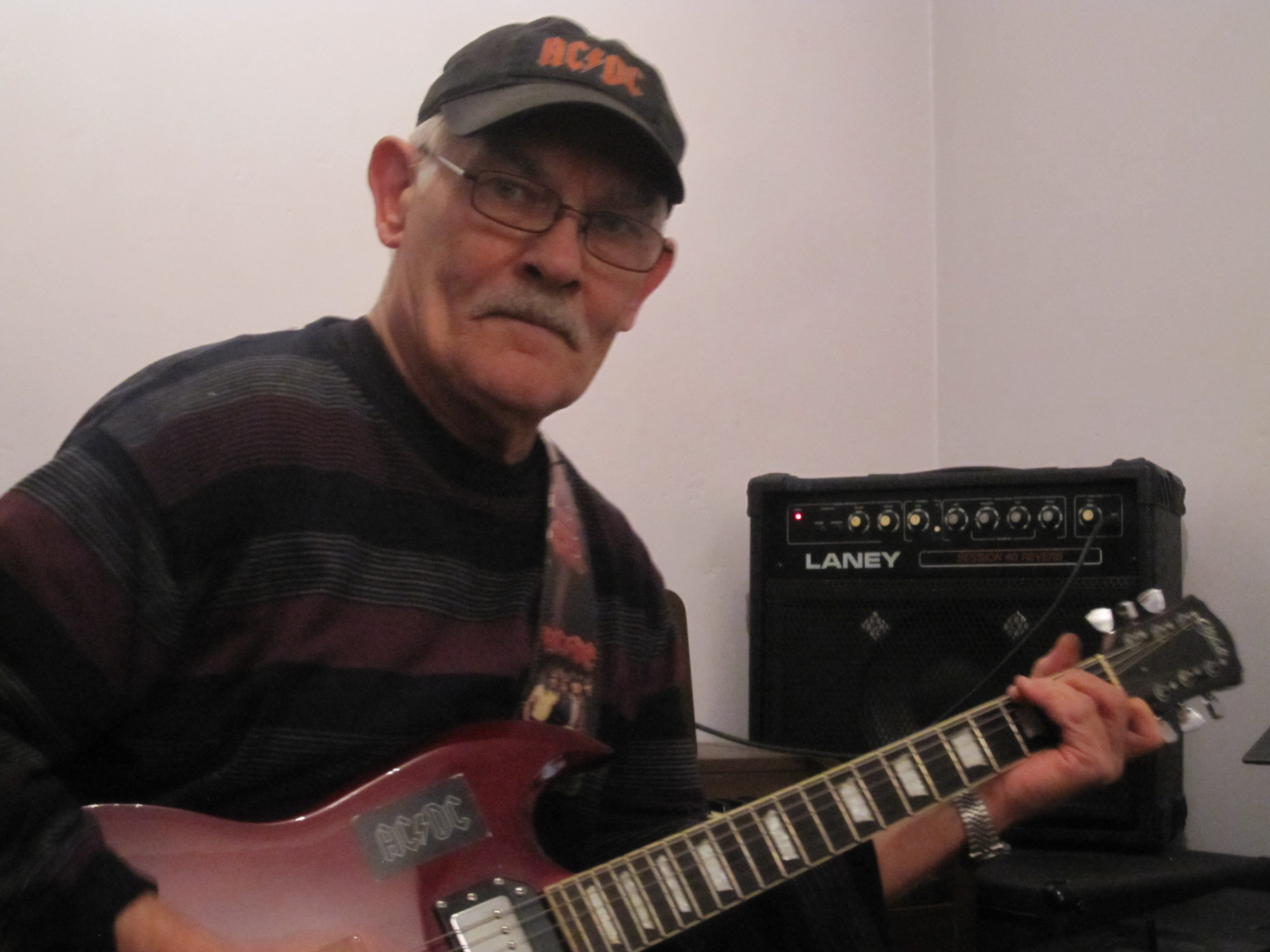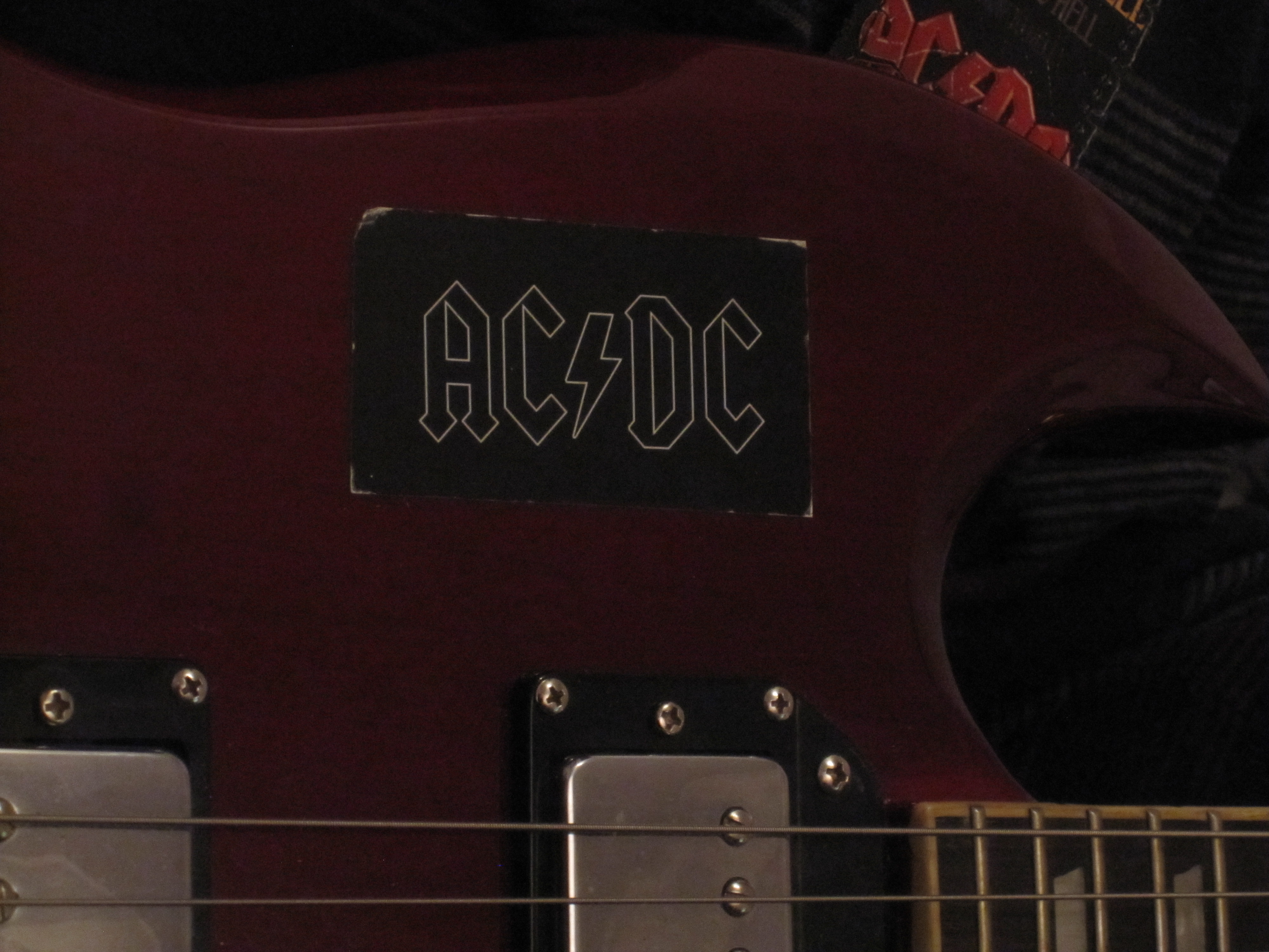 One of my students, Ade, already has an SG guitar like Angus Young from AC/DC. He also has an AC/DC sticker on that same guitar. He also has an AC/DC cap which he wears whilst playing the guitar with the sticker on.
